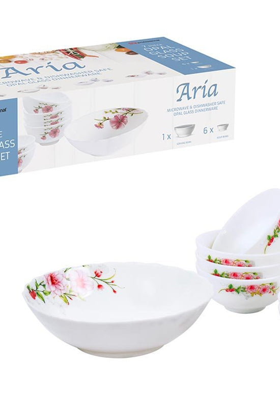 Enhance your dining experience with the exquisite 7-Piece Aria Opal Glass Soup Set. This set includes 1 stylish serving bowl and 6 delicate soup bowls, perfect for serving your favorite soups and stews in style.